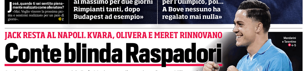 Il gol segnato domenica al Venezia, il primo della sua stagione a interrompere un digiuno prolungato dal 7 aprile, 266 giorni in totale, non è stato decisivo: certo ha reso la vicenda più bella e romantica, ma il destino era già stato stabilito negli ultimi giorni, in virtù di un principio che Conte ha tenuto a sottolineare sempre. Sin dai capitoli introduttivi del mercato d’inverno: non si rinuncia alla qualità. Non si lasciano andare via giocatori di qualità senza la certezza di poterli rimpiazzare con altrettante stoffe pregiate. Raspa, in questo senso, ha il tocco della seta: ha talento e colpi, però anche il problema di trovare continuità all’alba dei 25 anni (li compirà il 18 febbraio) e di uscire una volta per tutte dagli equivoci tattici che lo tormentano da tempo. E a questo, beh, ci sta pensando il signor Antonio: ha spiegato lui stesso di lavorare a una nuova soluzione tecnica, alla metamorfosi in una sorta di mezzala offensiva con il sangue del centravanti nelle vene. E Jack ha accettato il progetto con entusiasmo. Risultato: a gennaio non si muoverà. Fonte: CdS