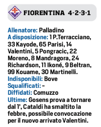 (Grafico) Fiorentina/Napoli: il Cds dà la sua formazione. Buongiorno si rivede al centro sportivo