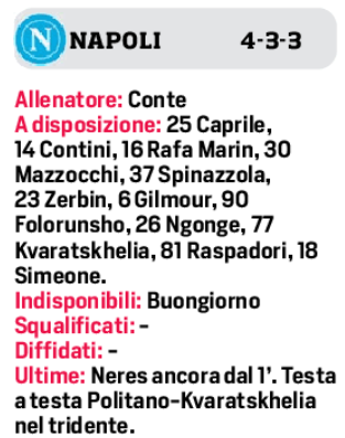 Un solo dubbio, nel tridente, e per il resto tutto come sopra. Tutto secondo i copioni scritti sia a Marassi contro il Genoa prima di Natale, sia al Maradona prima di Capodanno contro il Venezia: domani a Firenze giocherà Juan Jesus al posto dell’infortunato Buongiorno e via via gli altri della formazione declinata a memoria fino a Lukaku. Meret in porta; linea a quattro con Di Lorenzo, Rrahmani, JJ e Olivera; Anguissa, Lobotka e McTominay a centrocampo; e poi Neres e Romelu nel tridente, con il testa a testa Politano-Kvara. Da valutare la convocazione di Folorunsho, promesso sposo proprio della Fiorentina e già escluso dall’elenco dei convocati per la sfida con il Venezia. A proposito di Buongiorno: Alessandro s’è rivisto al centro sportivo di Castel Volturno dopo oltre due settimane di assenza. Una presenza graditissima, la sua assenza pesa in campo e nel gruppo, ma i tempi di recupero sono ancora lunghi.