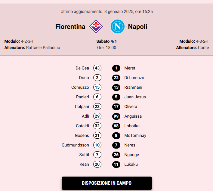 NewsCalcioSu X.com (Formazione) La Gazzetta mette in campo Fiorentina e Napoli che cambia gli esterni By Giuseppe Sacco il Gen 4, 2025 - 08:20:09 0 Condividi Gli azzurri in campo con una nuova formazioni, nuovi esterni Factory della Comunicazione Fonte: Gazzetta CalcioFiorentinaFormazioniNapoli 0 Condividi FacebookTwitterGoogle+ReddItWhatsAppPinterestE-mail