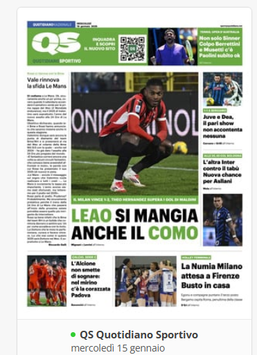 NewsCalcioRassegna Stampa “RASSEGNA STAMPA” – Le prime pagine sportive del 15 gennaio By Giuseppe Sacco il Gen 15, 2025 - 07:00:06 0 Condividi In primo piano sui principali quotidiani sportivi nazionali Factory della Comunicazione CalcioNapoliRassegnaStampa 0 Condividi FacebookTwitterGoogle+ReddItWhatsAppPinterestE-mail