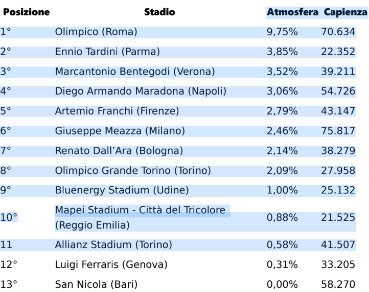 Da una parte abbiamo le grandi conferme di stadi importanti come lo Stadio Armando Maradona di Napoli, quarto classificato col 3,06%, e l’Artemio Franchi di Firenze, quinto posto 2,79%; dall’altra parte abbiamo solo un sesto posto per il Giuseppe Meazza – San Siro di Milano, nonostante sia lo stadio di due squadre blasonate come Inter e Milan e abbia la capienza maggiore, 75.817 posti. Il Parma, dopo anni molto bui a seguito del fallimento, con il suo Ennio Tardini schizza al secondo posto, con un punteggio di 3,85%. I commenti positivi sono a 360 gradi: oltre all’atmosfera molto apprezzato è il museo del Parma Calcio. Fonte: Il Mattino