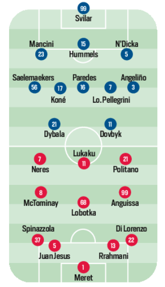 La probabile formazione vede Meret in porta, con Di Lorenzo, Rrahmani, Juan Jesus e Spinazzola in difesa. In mediana Anguissa, Lobotka e McTominay, mentre il tridente offensivo sarà composto da Politano, Lukaku e Neres.