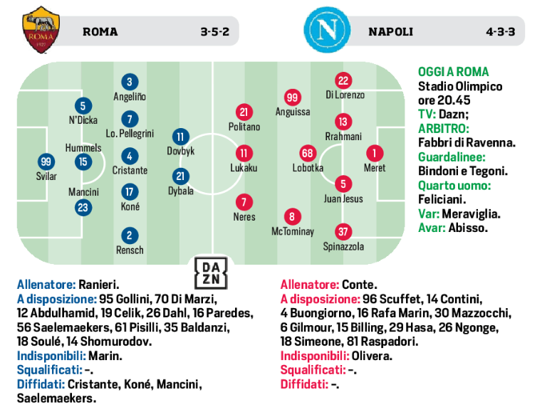 Casa Roma – Qualche novità ma niente stravolgimenti. Emblematica la valutazione su Dybala: Paulo tiene molto a giocare contro il Napoli e potrebbe accontentarlo. Lo stesso discorso può essere applicato su Pellegrini, che pure ha saltato una parte del secondo tempo in Europa League. Il turnover più massiccio verrà effettuato probabilmente domenica prossima a Venezia, anche in prospettiva della successiva trasferta di Oporto che rappresenta un bivio decisivo della stagione. Sono in ballo per un posto in squadra anche Rensch, Cristante, Pisilli ed El Shaarawy. Ma Ranieri come al solito comunicherà la formazione nel pomeriggio, prima di partire per lo stadio.
