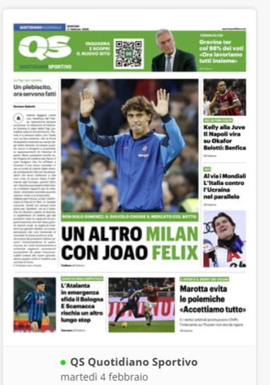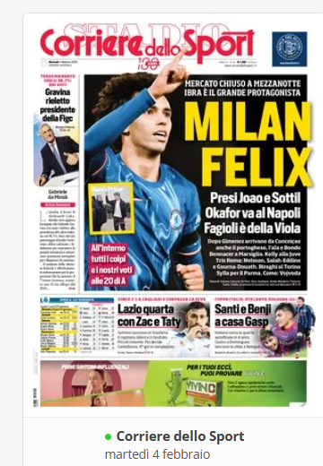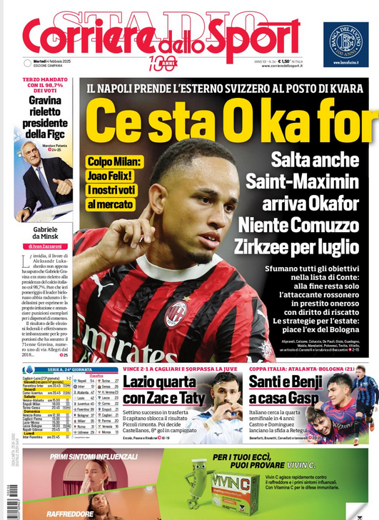 NewsCalcioIn Evidenza “Rassegna stampa” – Prime pagine sportive nazionali del 4 febbraio By Giuseppe Sacco il Feb 4, 2025 - 07:00:17 0 Condividi In primo piano sui principali quotidiani sportivi nazionali Factory della Comunicazione CalcioNapoliRassegnaStampa 0 Condividi FacebookTwitterGoogle+ReddItWhatsAppPinterestE-mail