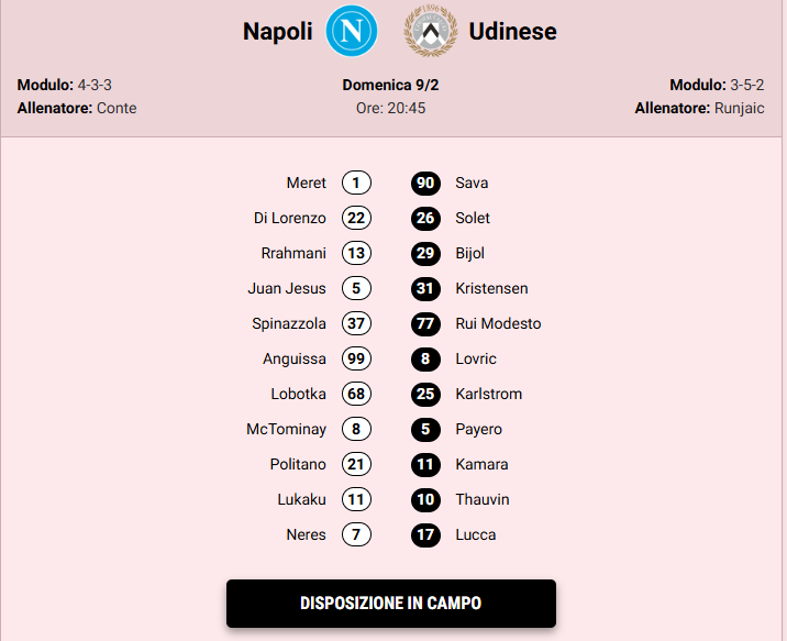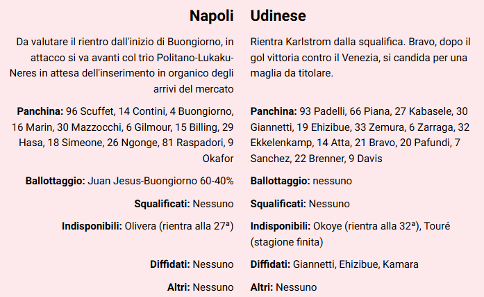 Appuntamento a domani sera, ore 20.45 con Napoli/Udinese. Secondo La Gazzetta dello Sport, Antonio Conte si atterrà al credo calcistico “squadra che vince non si cambia”. Per la rosea, infatti, nonostante il recupero di Buongiorno, dopo due mesi di box, il tecnico si affiderà ancora una volta a Juan Jesus. Per il resto diga a centrocampo e tridente in attacco, con Spinazzola al posti di Olivera.