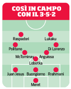 programma domani alle 18 all’Olimpico con la Lazio. Un marchio registrato, un pezzo del Dna del passato (vincente) di un allenatore che gioca con i moduli e i numeri, plasmando la linea difensiva e l’attacco a immagine e somiglianza di momenti e necessità. La prima mossa accreditata: Raspadori al fianco di Lukaku modello Inter 2019-2021, replicando con le dovute proporzioni legate a epoche e uomini la coppia Lautaro-Rom. Giusto un riferimento, tanto per capirci. Una novità assoluta per il Napoli di Conte: fino alla quinta giornata con la Juve, e dunque dal momento del passaggio alla difesa a quattro e al cambio modulo per favorire l’ingresso nel sistema e l’impatto di McTominay, la squadra ha giocato con il 3-4-2-1. Senza il tridente e i trequartisti, insomma, Jack farà l’attaccante puro, la seconda punta a sostegno di Romelu: teoricamente dovrebbero trarre giovamento sia lui, che per attitudini e ispirazione preferisce agire in questo ruolo se non da centravanti, sia Lukaku, sicuramente più abituato a muoversi con un partner al suo fianco. Fonte: CdS
