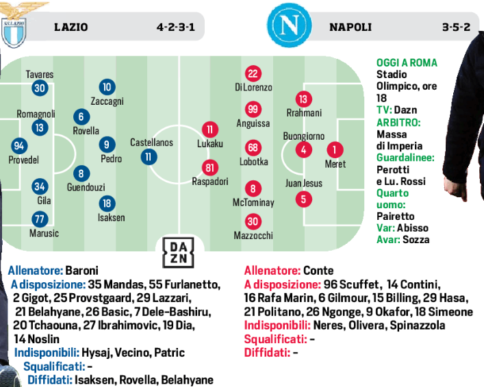 Napoli con le due punte e un’anima vincente formato 3-5-2. Difesa a tre e Mazzocchi a sinistra, da quinto, favorito su Politano. In definitiva, scrive il CdS, la formazione che dovrebbe iniziare il terzo round della stagione contro la Lazio prevede Meret in porta; un tris di centrali formato da Rrahmani, Buongiorno al centro e Juan Jesus; Di Lorenzo e Mazzocchi quinti; Anguissa, Lobotka e McTominay a comporre il blocco centrale; Lukaku e Raspadori in attacco.” In casa Lazio, invece: “Pedro o Dele nei Fab Four con Isaksen e Zaccagni da ali e Taty centravanti. Tutti simboli di questa Lazio liquida o fluida che dir si voglia, pronti a vorticare nei ruoli grazie al sostegno di Guendouzi e Rovella, sempre più calati nelle vite da mediani e da maratoneti. E’ confermata l’ultima difesa vista col Monza: Marusic, Gila, Romagnoli e Tavares.”