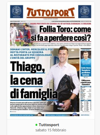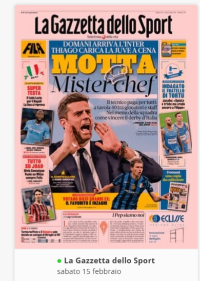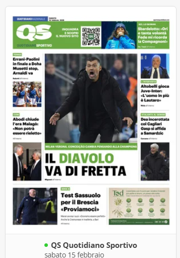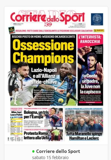 Su X.comCalcioIn Evidenza “Rassegna stampa” – Le prime pagine sportive del 15 febbraio By Giuseppe Sacco il Feb 15, 2025 - 06:59:54 0 Condividi In prima piano sui principali quotidiani sportivi nazionali Factory della Comunicazione CalcioNapoliRassegnaStampa 0 Condividi FacebookTwitterGoogle+ReddItWhatsAppPinterestE-mail