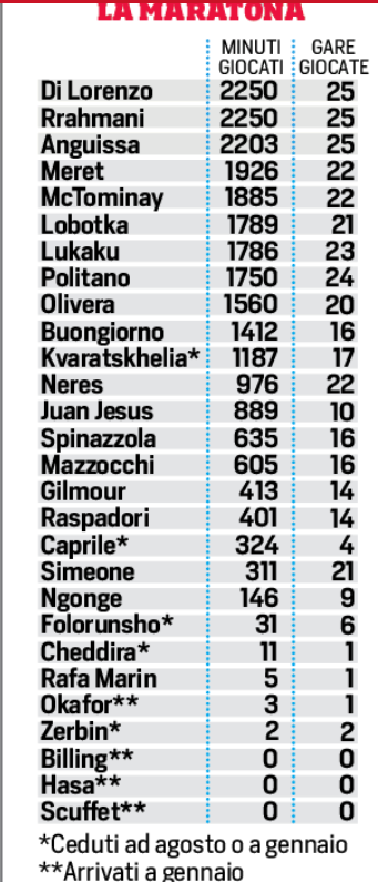 Titolari e riserve, ok, non si dice più e non piace a nessuno, ma non è che “sempre presenti” e “meno utilizzati” non nasconda lo stesso concetto. Nel Napoli, per esempio, la differenza è evidente. Scrive il Cds (con annesso grafico): “Scorrendo i dati si nota una profonda spaccatura tra un gruppo e l’altro. Quello di chi gioca regolarmente guidato da Di Lorenzo e Rrahmani, 25 presenze su 25 dall’inizio alla fine, mai sostituiti, 2.250 minuti. A seguire Anguissa, qualche minuto in meno per qualche cambio (2.203). Poi: Meret, McTominay (debutto alla quarta), Lobotka (nonostante l’infortunio), Lukaku (debutto alla terza) , Politano, Olivera e Buongiorno (infortuni compresi).