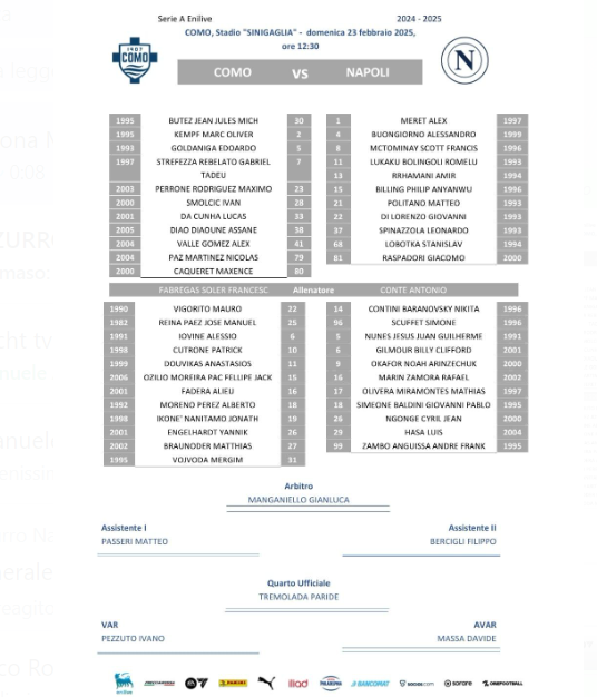 A disposizione: 96 Scuffet, 14 Contini, 16 Rafa Marin, 5 Juan Jesus, 17 Olivera, 6 Gilmour, 26 Ngonge, 99 Anguissa, 29 Hasa, 9 Okafor, 18 Simeone. All. Conte
