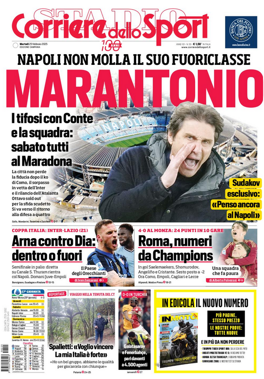 NewsCalcioIn Evidenza “RASSEGNA STAMPA”. Prime pagine sportive nazionali del 25 febbraio By Giuseppe Sacco il Feb 25, 2025 - 07:00:13 0 Condividi Factory della Comunicazione In primo piano sui principali quotidiani sportivi nazionali CalcioNapoliRassegnaStampa 0 Condividi FacebookTwitterGoogle+ReddItWhatsAppPinterestE-mail