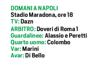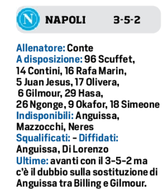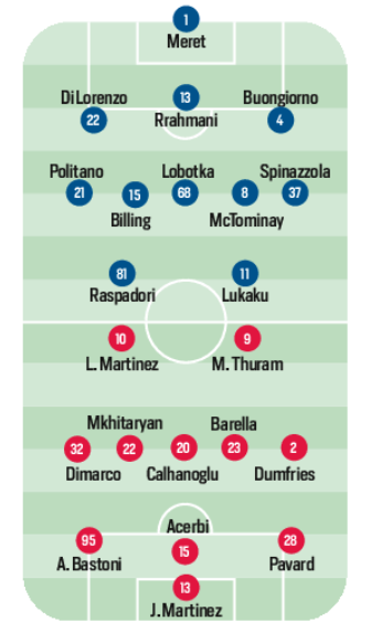 Napoli 3-5-2 come l’Inter, con Meret in porta; Di Lorenzo, Rrahmani e Buongiorno nel tris centrale; Politano a destra e Spinazzola a sinistra più avanti di Olivera; Lobotka in regia e McTominay con l’altra mezzala da scegliere; Lukaku e Raspadori in attacco.