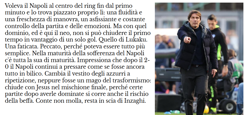 Il “Mattino” da un 7,5 ad Antonio Conte dopo Napoli-Fiorentina. Il quotidiano riconosce il dominio del Napoli, soprattutto nel primo tempo, ma l’imprecisione offensiva è un dettaglio non di poco conto. Chiudere il primo tempo con un solo gol di vantaggio- afferma il giornale campano- è un neo nella prestazione. Di seguito la pagella del tecnico azzurro.