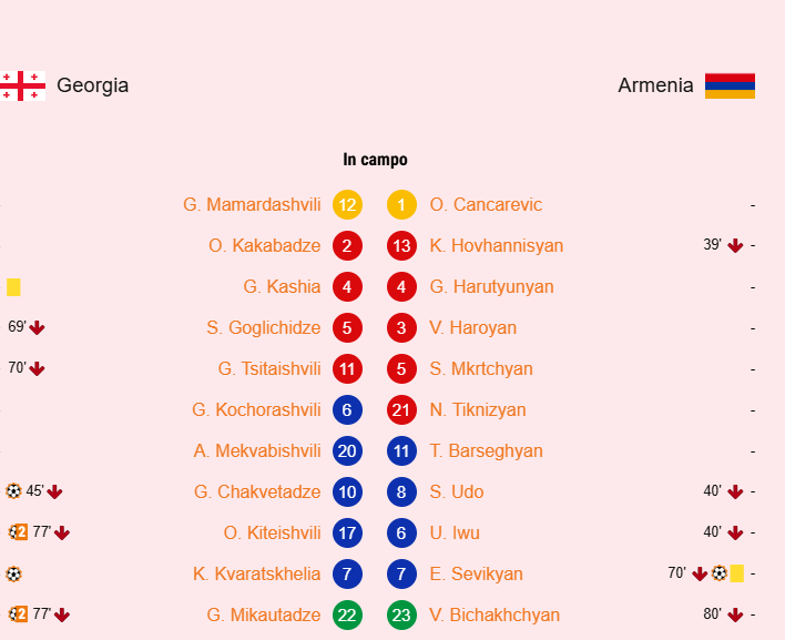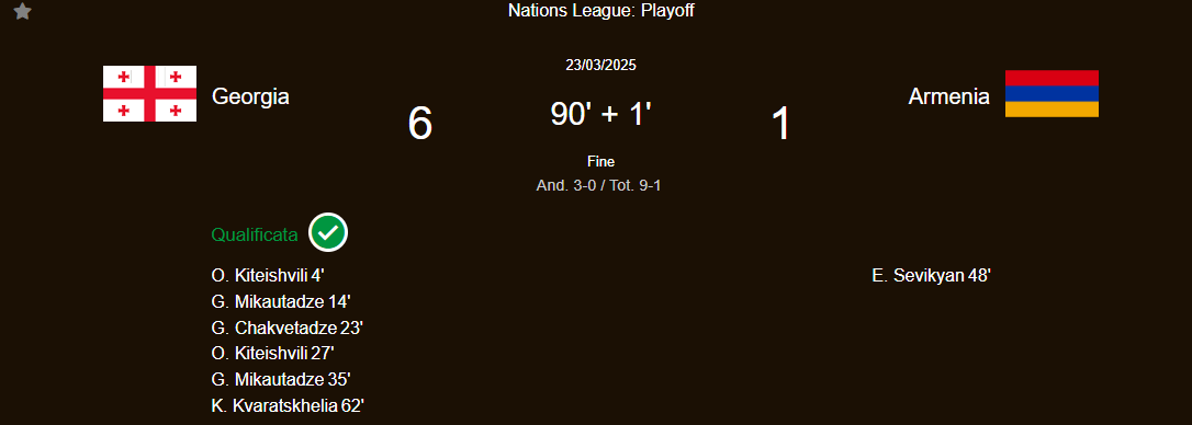 Nella giornata odierna la Georgia dell’ex Napoli Kvaratskhelia ha stravinto la sfida contro l’Armenia nei playoff di Nations League con il risultato tennistico di 6-1.