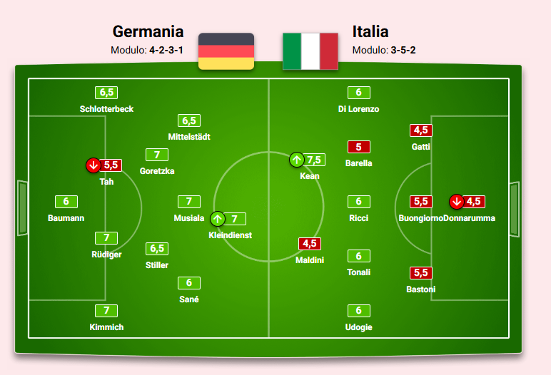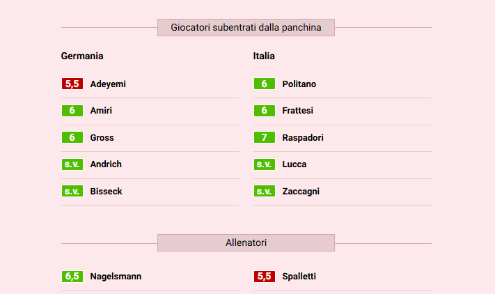 Germania/Italia 3-3. Una rimonta inutile, quella azzurra, dopo una prima frazione di gioco inguardabile. In grande difficoltà la difesa, Donnarumma in testa. Si prendono gol che sono veramente complicati, anche da spiegare. Poche le sufficienze, secondo La Gazzetta dello Sport, diverse quelle azzurro Napoli. I voti della rosea: