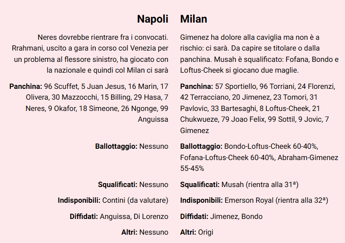 In attesa del match delle 20:45 che si terrà domani tra Napoli e Milan, e soprattutto in attesa di scoprire chi saranno i titolari, la Gazzetta dello Sport mette in campo quelle che potrebbero essere le due probabili formazioni: