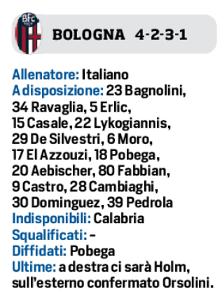 Mentre il 28enne Calabria  concludeva gli esami strumentali per conoscere l’entità del suo infortunio, il resto del gruppo ha iniziato la preparazione al posticipo di lunedì contro il Napoli. Castro ha proseguito il programma di lavoro personalizzato che lo porterà a rientrare in gruppo prima della partita contro la squadra di Conte. L’obiettivo dell’attaccante argentino, che si è fatto male al piede durante un allenamento con l’Argentina, è di tornare a giocare già lunedì, ma è tutt’altro che scontato che superi la concorrenza di Dallinga per essere schierato nell’undici titolare. Oggi a Casteldebole Italiano continuerà a fare le sue valutazioni per scegliere la formazione migliore.
