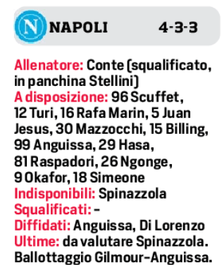 Doppia seduta di allenamento al centro sportivo di Castel Volturno. Clima mite, ritmi color inverno: rigidi, nessuna possibilità di allentare una concentrazione che dovrà rimanere altissima ora più che mai. Conte è un maestro dei finali, aprile è il suo mese, per lo scudetto ha lottato regolarmente e nessuno meglio di lui sa come si fa in questi casi. La squadra, del resto, ha dimostrato sin dal ritiro enormi capaci di sacrificio e in campo i risultati sono stati evidenti. A otto giornate dalla fine, e con il primo posto a tre punti, dalla 26ª in poi il Napoli è diventato inseguitore dell’Inter: un testa a testa che Conte spera di poter giocare fino alla fine con la rosa al completo, dopo un periodo di enorme emergenza. Ieri c’erano tutti anche se le condizioni di Spinazzola saranno valutate fino alla partenza per Bologna, in agenda domenica. Spina, per la cronaca, è reduce da un affaticamento che l’ha escluso dalla sfida contro il Milan. Conte recupera McTominay, altro assente con il Diavolo per un attacco influenzale: se i postumi risulteranno totalmente smaltiti, giocherà dal 1’ con ballottaggio tra Gilmour e Anguissa.