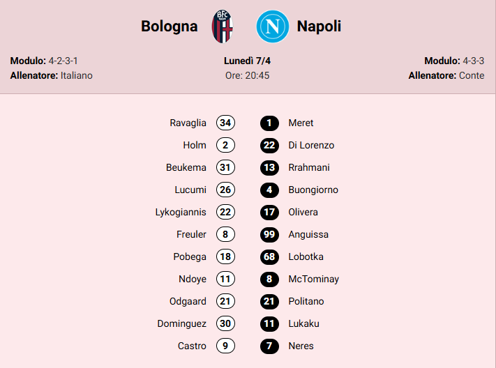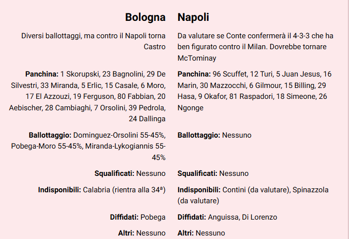 Un posticipo di lusso, un vero big match stasera al Dall’Ara. Si giocherà per le ambizioni “scudetto” del Napoli e per il raggiungimento della qualificazione Champions per il Bologna. Si attendono (ovviamente in serata) le scelte dei due tecnici, ma si può cominciare a ipotizzare…La Gazzetta dello Sport mette in campo così le due squadre: