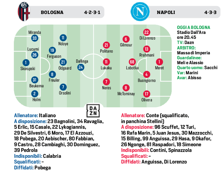 (Formazioni) – Bologna e Napoli dalle ultime news in campo scenderebbero così