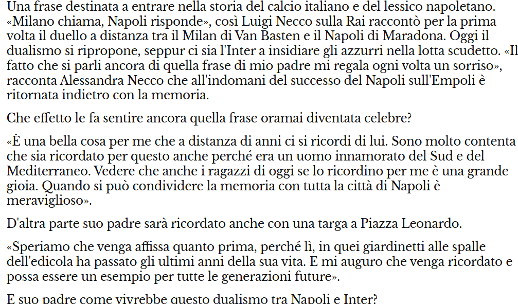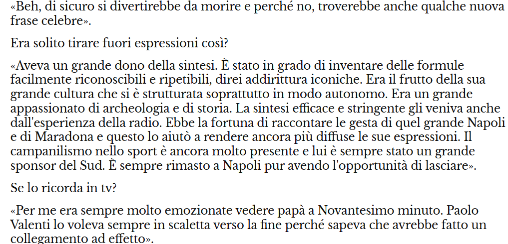 Dalle pagine de Il Mattino. Parla la figlia di Luigi Necco, Alessandra, parla della frase lanciata dal padre, giornalista che ha raccontato il Napoli.