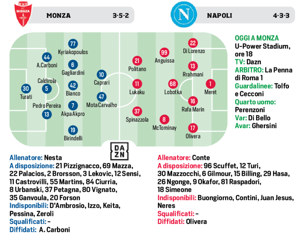 (Formazioni) Monza e Napoli: il Corriere le schiera in campo così