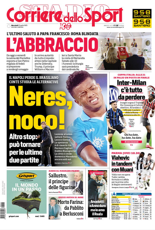 A sinistra c’è un problema atavico che ora si è rinnovato dopo l’ennesimo infortunio, il secondo di David Neres nel giro di due mesi, quello che ha preceduto la trasferta di Monza (19 giorni dopo il rientro col Milan) e i cui contorni ora sono più chiari dopo gli esami strumentali a cui il giocatore si è sottoposto. «Lesione distrattiva del soleo della gamba sinistra» recita il comunicato ufficiale del club, che tradotto vuol dire stop di 25-30 giorni (conteggiati da venerdì scorso) e rientro possibile per le ultime due, con probabilità più elevata soprattutto per l’ultima col Cagliari (weekend del 24-25 maggio). Si vedrà. Il tutto con ancora cinque giornate alla fine e la prossima, domenica con il Torino, che già vale una finale in ottica scudetto. Una finale alla quale Neres non prenderà parte evidenziando ancora una volta l’emergenza improvvisa sulla corsia mancina che ha visto coinvolti tutti gli interpreti sin dalla cessione di Kvara: oltre al brasiliano, infatti, si sono fermati nel recente passato Olivera, Spinazzola e anche Mazzocchi, jolly che Conte ha utilizzato anche lì. Fonte CDS