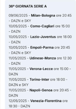 Il numero uno del massimo campionato ha anche annunciato le date della trentaseiesima giornata: ” il 9 maggio ci sarà Milan-Bologna alle 20.45 visto che poi ci sarà la finale di Coppa Italia. Lo sforzo della Lega è quello di dare un prodotto sempre più bello, amare il nostro calcio vuol dire passare per delle immagini sempre più accattivanti e vedrete quello che faremo a Roma. Il sabato 10 maggio ci saranno Como-Cagliari alle 15, Lazio-Juventus alle 18 e poi Empoli-Parma alle 20.45. Domenica 12.30 Udinese-Monza, alle 18 Torino-Inter e alle 20.45 Napoli-Genoa. Il lunedì Venezia-Fiorentina e poi Atalanta-Roma”.