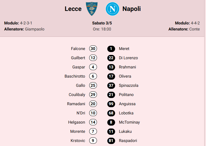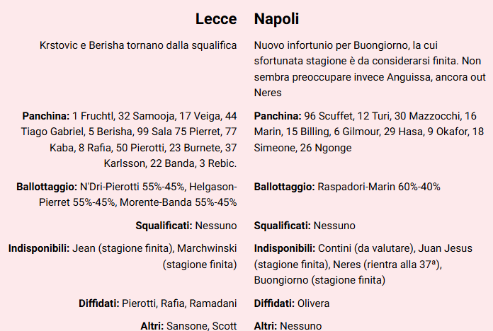 Per la Gazzetta al momento Lecce e Napoli scenderebbero in campo così