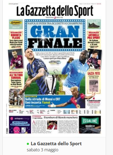 XCalcioIn Evidenza “RASSEGNA STAMPA” – Prime pagine sportive del 3 maggio By Giuseppe Sacco il Mag 3, 2025 - 07:00:06 0 Condividi In primo piano sui principali quotidiani sportivi nazionali Factory della Comunicazione CalcioNapoliRassegnaStampa 0 Condividi FacebookTwitterGoogle+ReddItWhatsAppPinterestE-mail