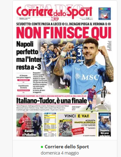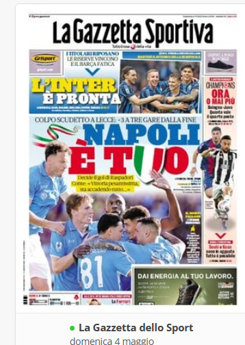 XCalcioIn Evidenza ⚽️”RASSEGNA STAMPA”⚽️ – Prime pagine sportive del 4 maggio By Giuseppe Sacco il Mag 4, 2025 - 07:00:35 0 Condividi In primo piano sui principali quotidiani sportivi nazionali Factory della Comunicazione CalcioNapoliRassegnaStampa 0 Condividi FacebookTwitterGoogle+ReddItWhatsAppPinterestE-mail