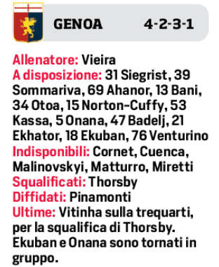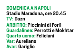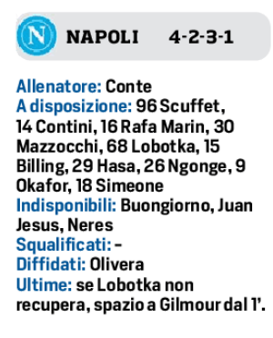 Sono pochi i suoi dubbi di formazione. Anche perché, detto di Lobo, le assenze certe saranno tre, le solite: Juan Jesus, per cui la stagione si è ormai conclusa, Buongiorno (si tenterà di recuperarlo per l’ultima col Cagliari) e Neres, che spera di esserci per andare in panchina a Parma. E allora, spazio ai soliti noti, alla squadra che ha vinto al Via del Mare. Sono state positive le indicazioni avute. In difesa, ad esempio, Olivera ha fatto molto bene accanto a Rrahmani. Utile con la sua fisicità ma anche prezioso in fase di uscita. Un ruolo, quello di centrale, che ha ricoperto già in nazionale uruguaiana e che Conte tornerà a sfruttare per tamponare l’emergenza. In attacco non ci sono dubbi sulla conferma di Raspadori. L’ha meritata sul campo con il quinto gol in campionato, decisivo come quello contro il Venezia. Accanto a Lukaku l’intesa cresce e la squadra ha l’equilibrio necessario per sostenerli. Con Meret in porta, completeranno l’undici Di Lorenzo e Spinazzola terzini, McTominay largo a sinistra solo in partenza e, a destra, Politano.