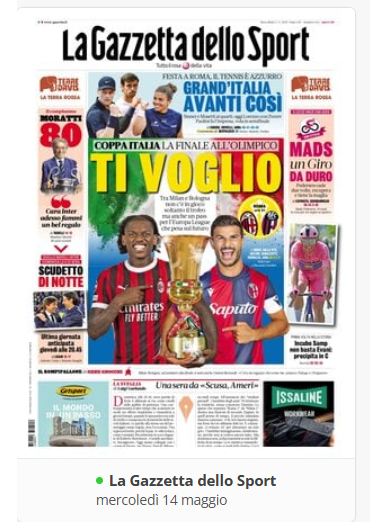 XCalcioNews ⚽️RASSEGNA STAMPA⚽️ Le prime pagine del 14 maggio By Giuseppe Sacco il Mag 14, 2025 - 07:00:47 0 Condividi In primo piano sui principali quotidiani sportivi nazionali Factory della Comunicazione CalcioNapoliRassegnaStampa 0 Condividi FacebookTwitterGoogle+ReddItWhatsAppPinterestE-mail