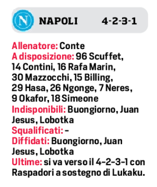Meret in porta; linea a quattro con Di Lorenzo, Rrahmani, Olivera per la terza volta da marcatore centrale e Spinazzola a sinistra; Anguissa con Billy in mediana; Politano e McTominay più larghi a destra e a sinistra sulla trequarti in partenza; e per finire il tandem d’attacco Lukaku-Raspadori. Con Jack che tendenzialmente dovrebbe godere di quella libertà di movimento tale da galleggiare tra le linee, di abbassarsi a legare il gioco e di strappare verso la porta. Girovagando nei pressi di Romelu insieme con McT e Politano. Oggi e domani andranno in scena altre due sedute di allenamento al centro sportivo di Castel Volturno, tendenzialmente le definitive per le scelte; e a seguire il gruppo partirà per il ritiro di Parma, dove domenica ci sarà come minimo il consueto risveglio muscolare. L’attesa monta a dismisura ovunque tra i tifosi. Da Napoli all’Emilia: al Tardini ci saranno 3.500 tifosi nel settore Ospiti, fermo restando la possibilità di una presenza ulteriore negli altri spicchi dello stadio, nonostante le varie limitazioni.