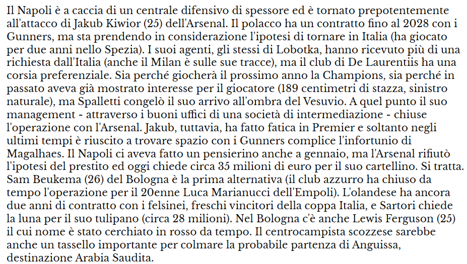 Si ritorna sul mercato, ritornano le vecchie esigenze. Occorre rinforzare la difesa con un centrale di spessore da poter inter-scambiare con Rrahmani e Buongiorno. L’obiettivo principale, quello in cima alla lista, è sempre Kiwior. Ne scrive Il Mattino: