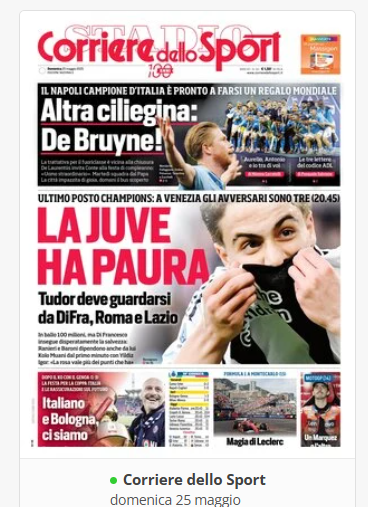 XCalcioNews 😀BUONA DOMENICA da ilnapolionli.com ⚽️RASSEGNA STAMPA⚽️ Prime pagine sportive del 25 maggio By Giuseppe Sacco il Mag 25, 2025 - 07:00:57 0 Condividi In primo piano sui principali quotidiani sportivi nazionali Factory della Comunicazione CalcioNapoliRassegnaStampa 0 Condividi FacebookTwitterGoogle+ReddItWhatsAppPinterestE-mail
