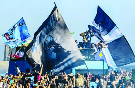 SI BALLA. La squadra e i dirigenti arrivano intorno alle 15 al Molo Luise, via mare, a bordo di un aliscafo Snav scortato dai gommoni delle forze dell’ordine e dallo stuolo delle barche di tifosi che scelgono una poltrona galleggiante per godersi lo spettacolo. Sì, è stato davvero uno spettacolo da raccontare che non andrà mai più via dagli occhi di tutti quelli che l’hanno vissuto e interpretato: balla De Laurentiis, balla e fa festa il ds Manna, saltano e cantano Antonio e Gianluca Conte, il vice Stellini, Oriali, Maiuri, i prof Coratti e Cacciapuoti, Abbruscato, i dottori Canonico e De Luca, gli uomini dell’area comunicazione Lombardo, Baldari e Lombardi, i magazzinieri Starace e Di Paolo e tutti quelli che ogni giorno hanno lavorato dietro le quinte alla riuscita dell’opera.