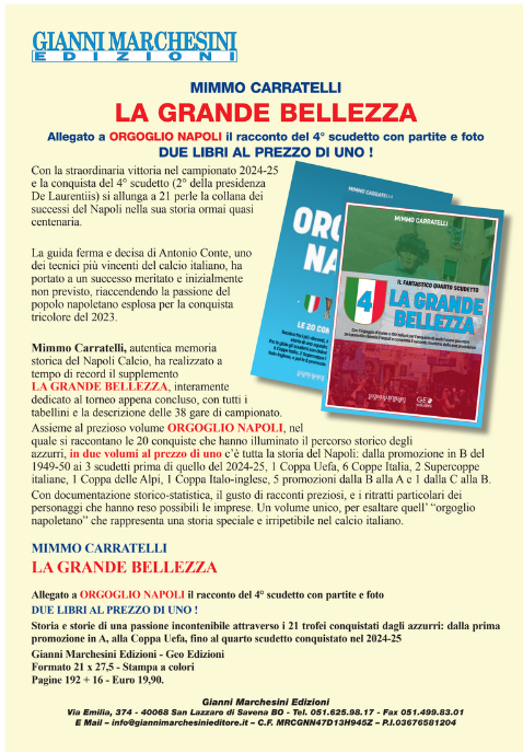 Per celebrare questa impresa, esce “LA GRANDE BELLEZZA”, il nuovo volume di MIMMO CARRATELLI allegato a “ORGOGLIO NAPOLI”, che racconta con foto, tabellini e storie tutte le 38 partite del campionato appena concluso. Due libri al prezzo di uno per ripercorrere i 21 trofei conquistati dal Napoli, dalla prima promozione in Serie A fino all’ultimo trionfo tricolore, attraverso i protagonisti e le emozioni di una passione senza confini.