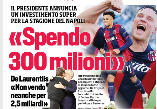 voglio dire che è merito di Conte se abbiamo vinto lo scudetto: è riuscito a risolvere ogni problema che pensavamo difficile, facendo fronte ai tanti incidenti che ci sono capitati e che fanno parte del gioco», l’apertura. «Ho fatto un calcolo: l’anno scorso ho investito centocinquanta milioni e quest’anno, tra stipendi e investimenti, andranno via trecento milioni», la chiusura. Con inchino: «Il Napoli sarà mio finché avrò vita e poi i miei figli faranno ciò che vorranno. Non lo venderei neanche se mi offrissero due miliardi e mezzo».