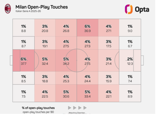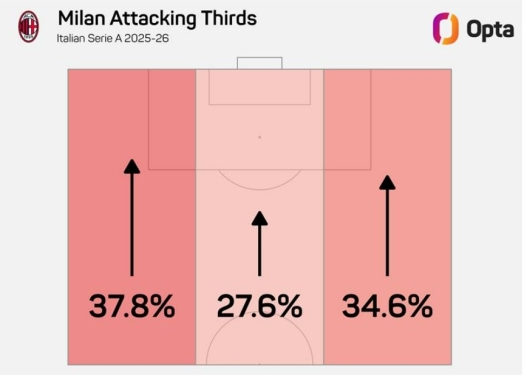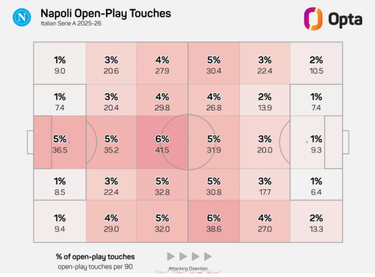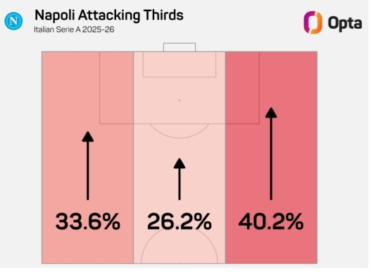 Differenze? Beh, molte… e molto oltre il fatto che Conte in stagione abbia alternato difesa a quattro e linea a tre, l’unica contemplata da Allegri. Cambiano le soluzioni preferite. Conte usa Hojlund come grande riferimento, quasi un playmaker offensivo: il Napoli si appoggia a lui e da lì sviluppa il suo gioco, come faceva con Lukaku in passato. Leao e Pulisic ovviamente hanno caratteristiche diverse e Allegri li usa per quello che riescono a fare meglio: ripartire, farsi trovare negli spazi, attaccare l’area in rapidità. Un’altra differenza: l’uso delle fasce. Politano e Saelemaekers sulla carta giocano in una posizione simile ma hanno compiti molto diversi. Alexis nel Milan aiuta molto in fase difensiva e, dopo l’ottimo inizio di stagione, è meno decisivo nell’area avversaria. Politano invece per Conte è strategico, anche in una stagione di alti e bassi, e il Napoli una squadra sbilanciata: attacca molto di più a destra (40,2%) che a sinistra (33,6%).