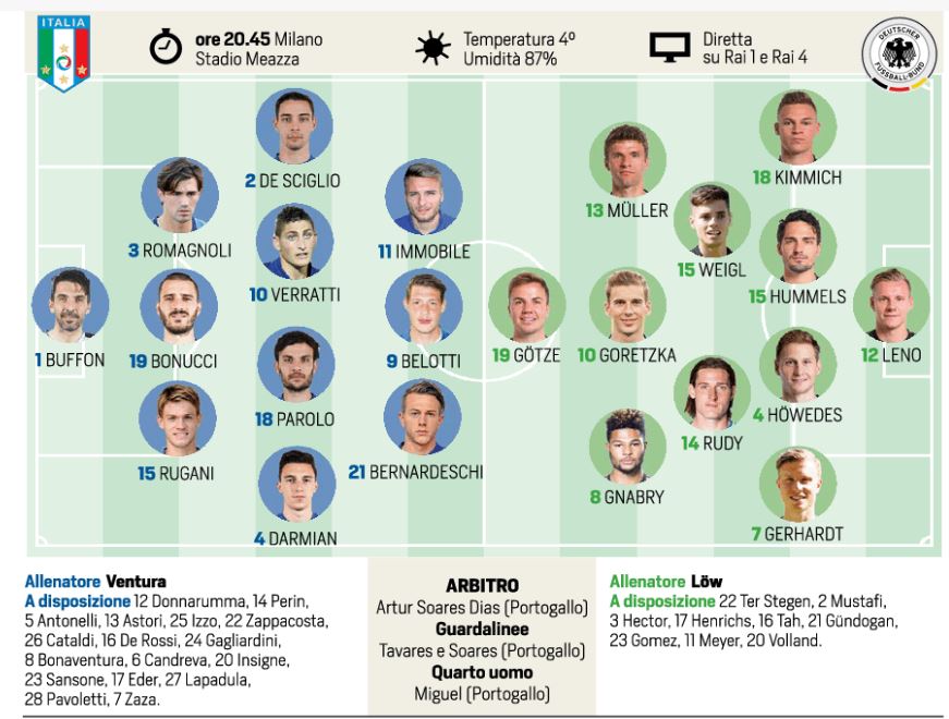 Tra molte incertezze, legate al tempo minimo per fare le scelte più mirate, tra situazioni sanitarie precarie (Candreva acciaccato, Eder recuperato solo ieri, in ballottaggio con Immobile, Politano a casa e probabilmente indisponibile per la trasferta a Genova di domenica contro la Samp), tra scenari di derby incombenti… ecco che l’Italia torna a difendere a 3. Dopo il debutto a Vaduz del suo 4-2-4 già messo in cantiere, Ventura, dunque ha preferito tornare all’antico. Eppure anche in questo “retropassaggio” c’è molto del suo nuovo corso. Lui stesso aveva spiegato più volte che la presenza della BBC, la mitica linea difensiva juventina formata da Bonucci, Barzagli e Chiellini, imponeva anche alla sua Nazionale un sistema di gioco conseguente. In questo caso però due dei tre senatori bianconerazzurri sono a Torino, indisponibili per queste due partite novembrine. Ebbene stasera contro la Germania, ci sarà il battesimo della RBR. No, niente sim racing games (Richard Burns Rally): molto più calcisticamente partirà la corsa del trio Rugani-Bonucci-Romagnoli, con Leo primo pilota e navigatore dei due giovani compagni predestinati a sostituire lo storico blocco juventino al centro della difesa azzurra. Fonte: CdS